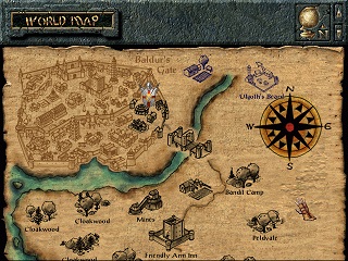 The over-world exploration is where you will spend most of your time in Baldur's Gate. The game world is set in the Sword Coast Region in Faerun. The map consists of many different locations from forests, towns, dungeons, rocky dry peaks, ruins, and the titular city of Baldur's Gate itself.